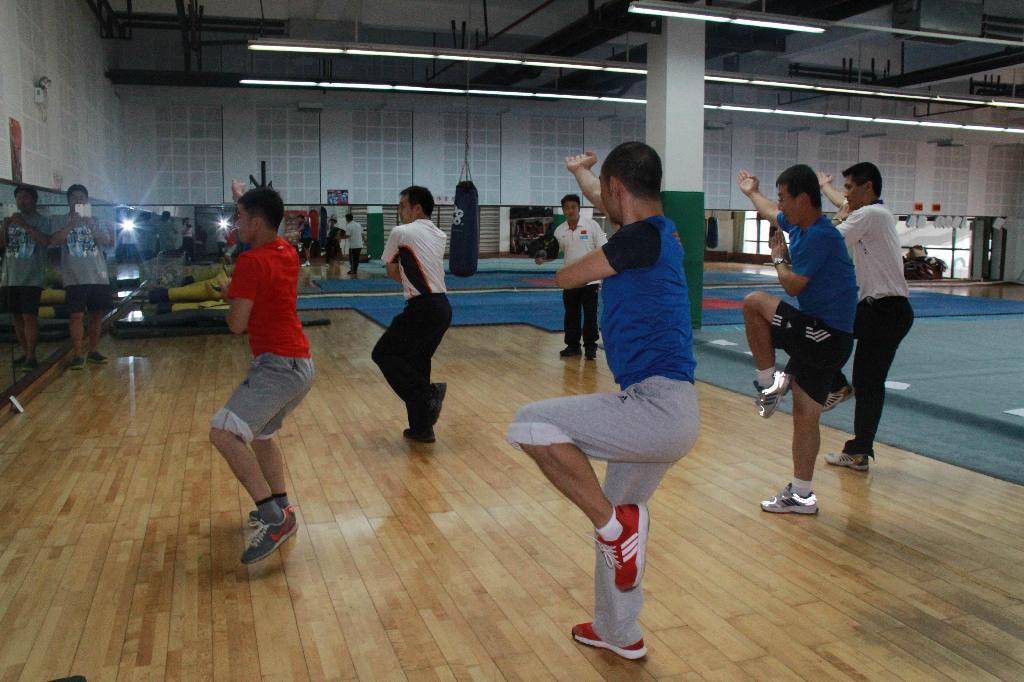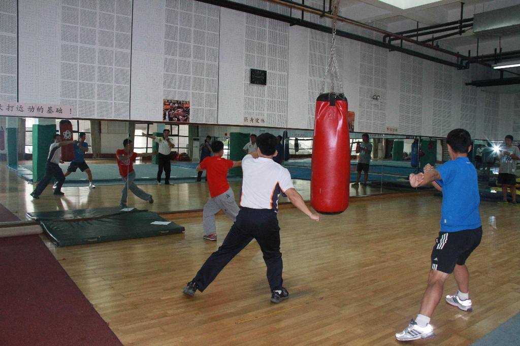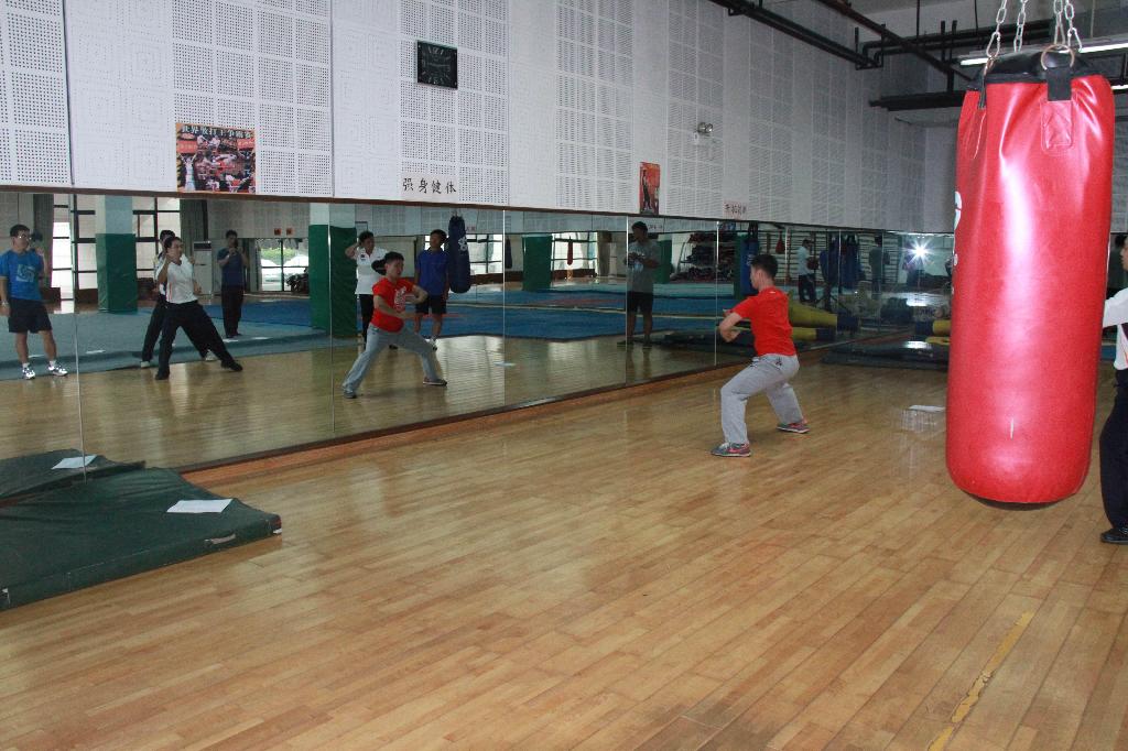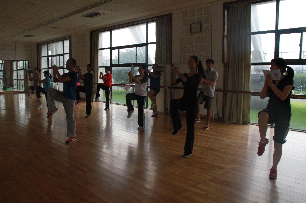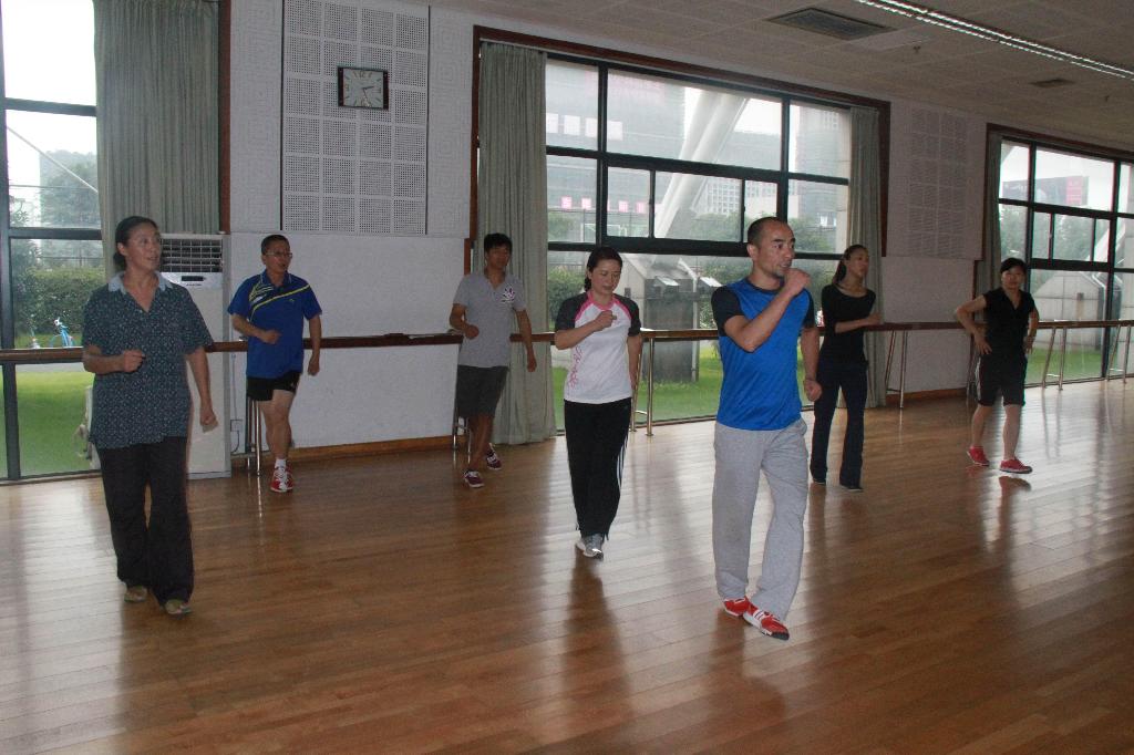 开展的可行性、必要性、实效性。从武术、健美操进行教学改革,特别是教考分离的实施的介绍,以及对往年武术与健美操考核成绩比较分析,进一步明确了教学过程中“教”与“学”的密切相关性。然后将全体教师分组进行实践学习与演练。在散打房,以担任男生班为主体的男教师,在应昌达老师的带领下对青年防卫拳的整个套路,逐招、逐式的进行动作演练、讲解、规范。从攻防演练、到实战应用、再到每一动作的发力点,环环相套,最终明确了教学的关键点。在体育舞蹈房,以担任女生班为主体的女教师和部分男教师,在姚智勇老师的带领下,学习新的三套一级大众健身操,从每一动作的规格、协调、律动再到节奏,丝丝入扣,教师细致揣摩,认真练习,反复体会,伴随着动感的音乐,在轻松愉悦的气氛中,取得令人满意的效果。整个教研活动持续了近两个小时。