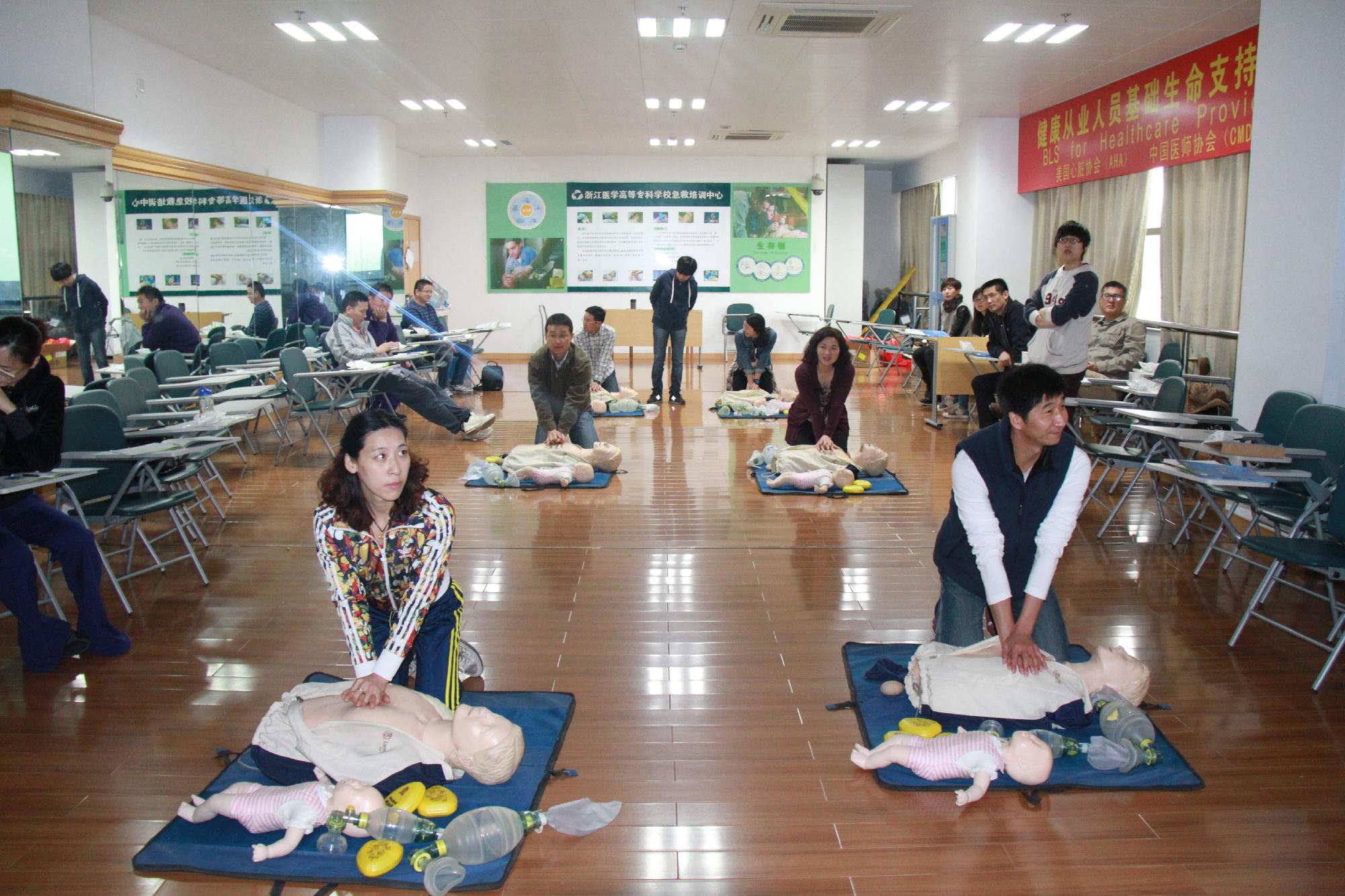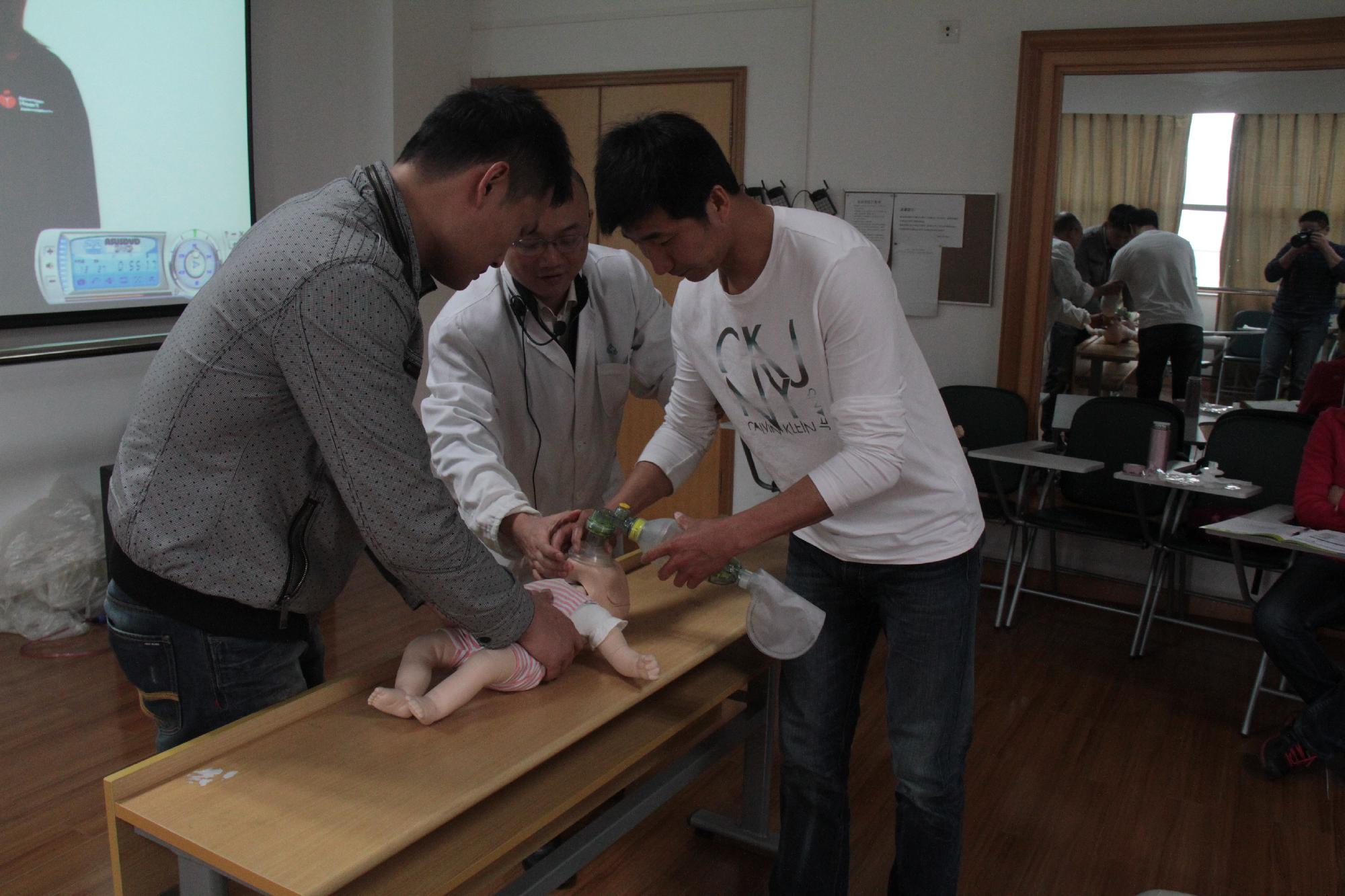 培训的主讲老师按照美国心脏协会规定的课程对老师们讲解了成人心肺复苏和AED使用,儿童和婴儿心肺复苏以及异物梗阻的抢救等内容。虽然仅有3个小时的课程学习,但是教师们通过理论学习和实际操作,感到收获颇丰。不仅学到了较前沿的急救专业知识,而且给我们带来了一种崭新的教学理念。
