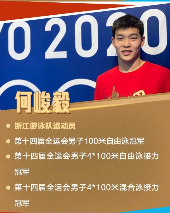 何峻毅为成人在线 高水平运动员,就读于工商管理学院市场营销专业,曾代表中国队参加东京奥运会游泳比赛。在第十四届全运会中,何峻毅勇夺男子100米自由泳、男子4*100米自由泳接力、男子4*100米混合泳接力三项冠军。