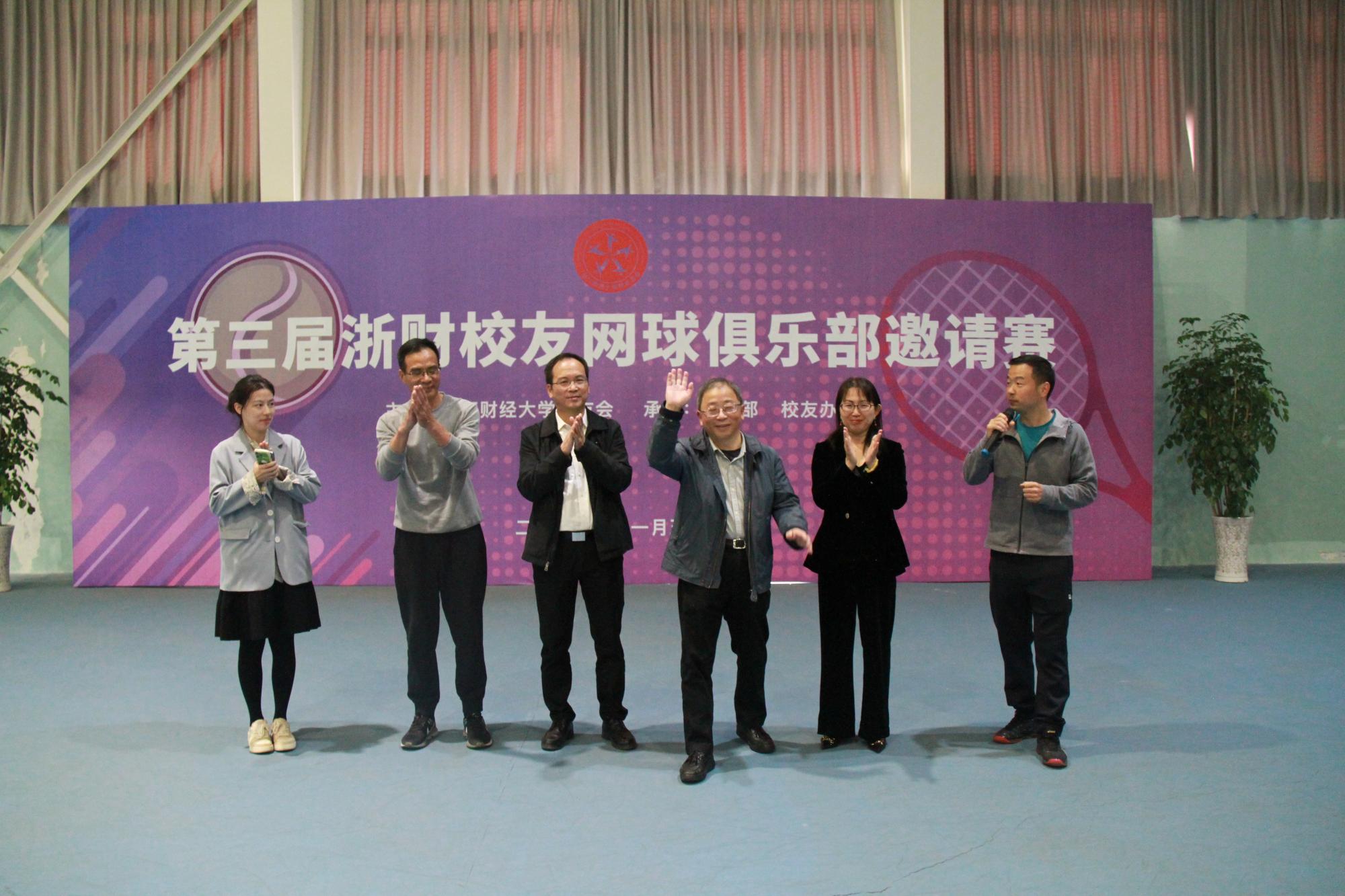 余建森在第三届浙财网球俱乐部邀请赛开幕式上致辞。他对校友们长期以来对成人在线
