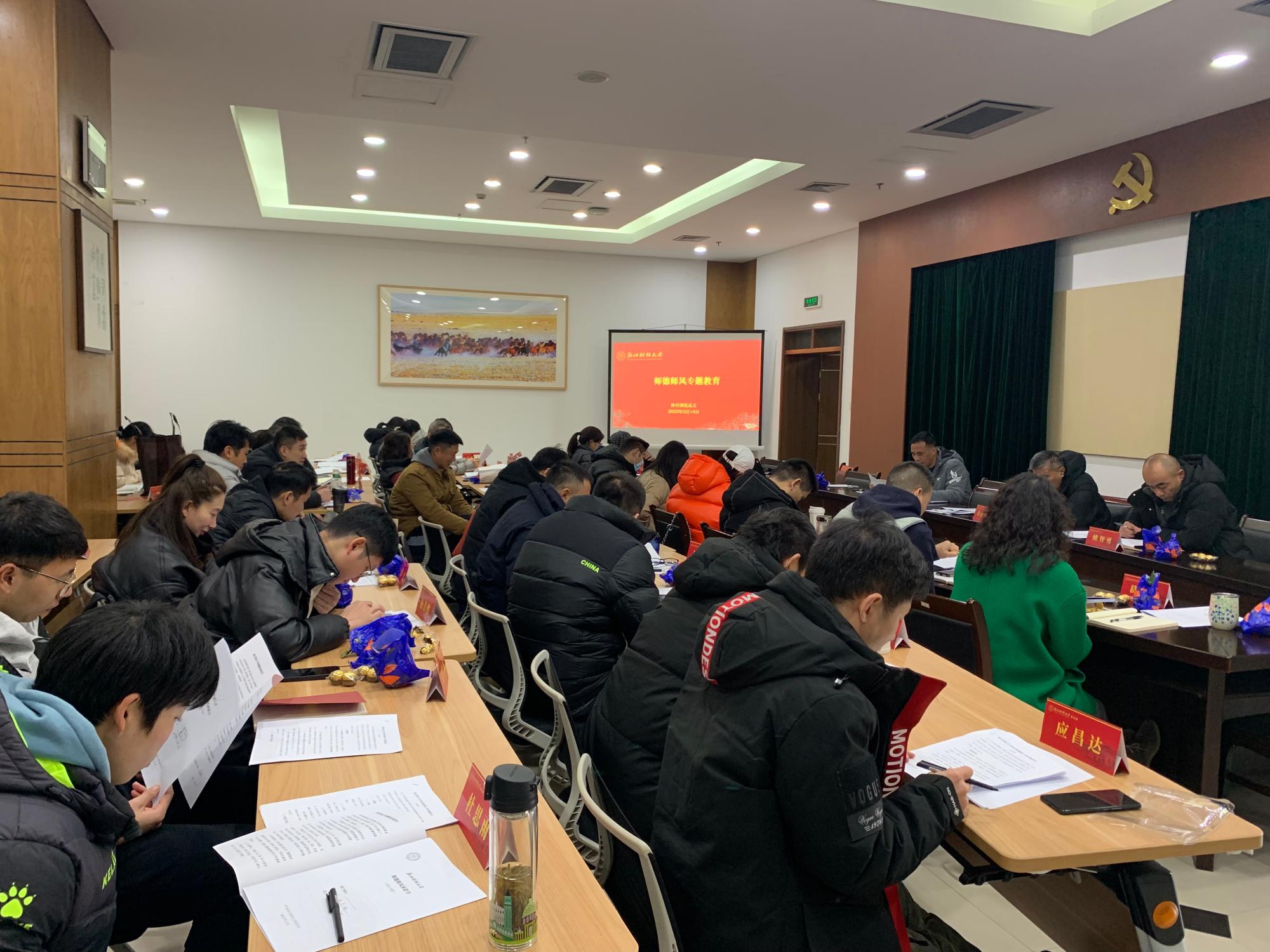 党总支书记汤慧炎带领全体教师认真学习了《新时代高校教师职业行为十项准则》,从坚定政治方向、自觉爱国守法、传播优秀文化、潜心教书育人、关心爱护学生、坚持言行雅正、遵守学术规范、秉持公平诚信、坚守廉洁自律、积极奉献社会等方面明确教师自身责任。