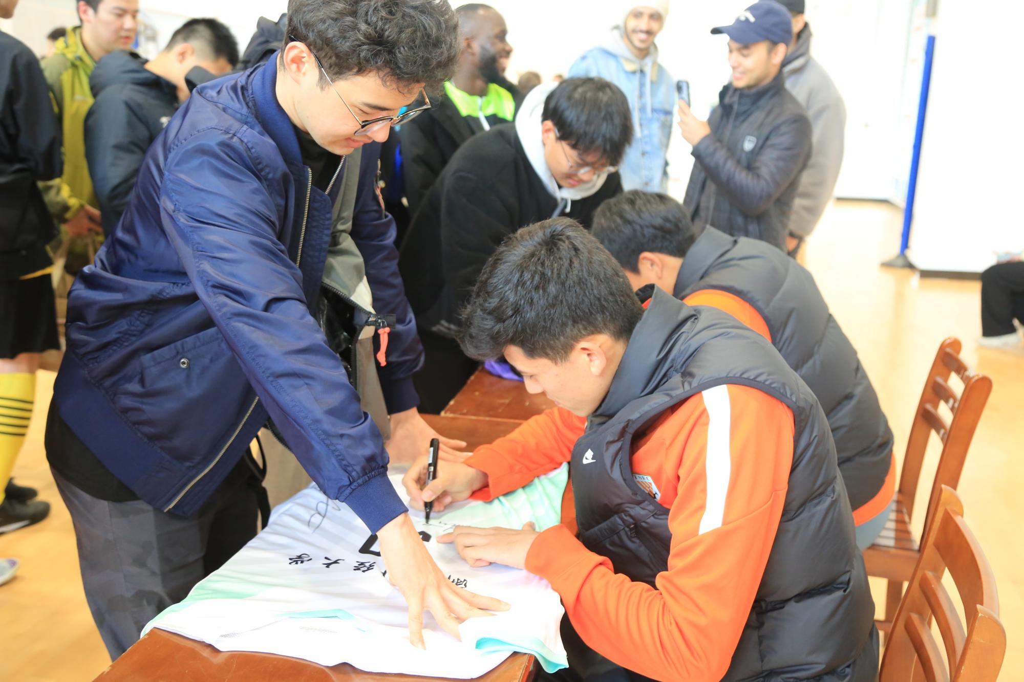赠送签名球衣和足球,与大学生球迷合影互动,表达对成人在线