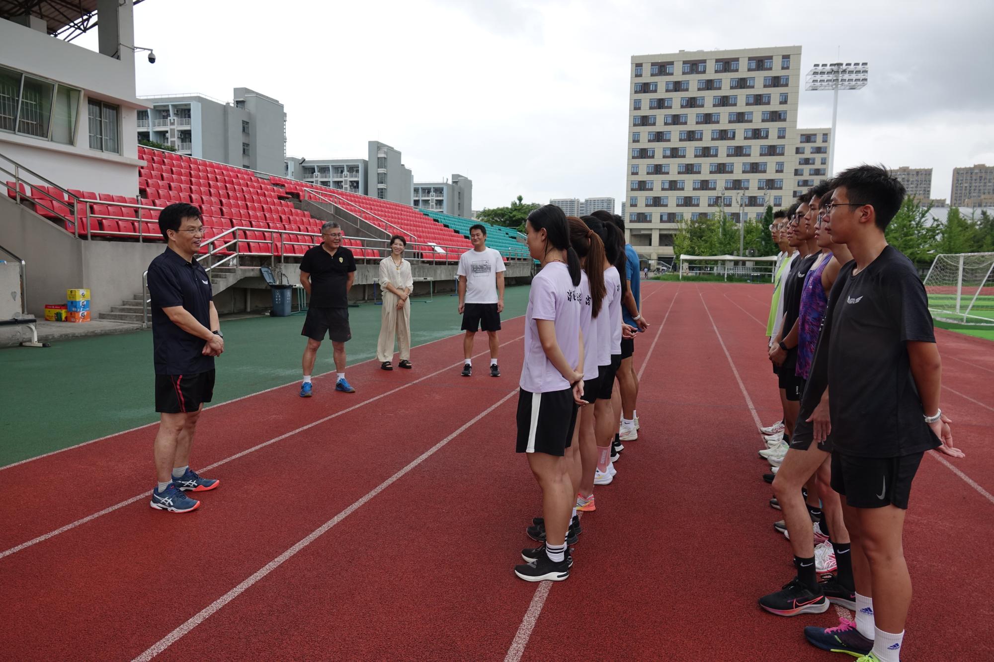 7月27日,副校长董进才来到体育场馆训练一线,看望慰问正在集训的浙江省大学生游泳队和校田径队。