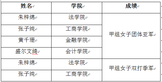 共派出4名学生运动员参加第26届中国大学生网球锦标赛(总决赛)。在领队徐家伟、教练罗旭的指导下,充分发挥团队力量和顽强拼搏的精神,在团体赛中以小组第二出线,先后战胜中央财经大学、武汉大学与华中科技大学,决赛中惜败于北京外国语大学,获得甲组女团亚军;在单项赛双打项目中,运动员先后战胜上届冠军暨南大学、西南财经大学进入八强,战胜华中科技大学挺进半决赛,打满70分钟抢七输给本届冠军西安交通大学,最终获得甲组双打季军。