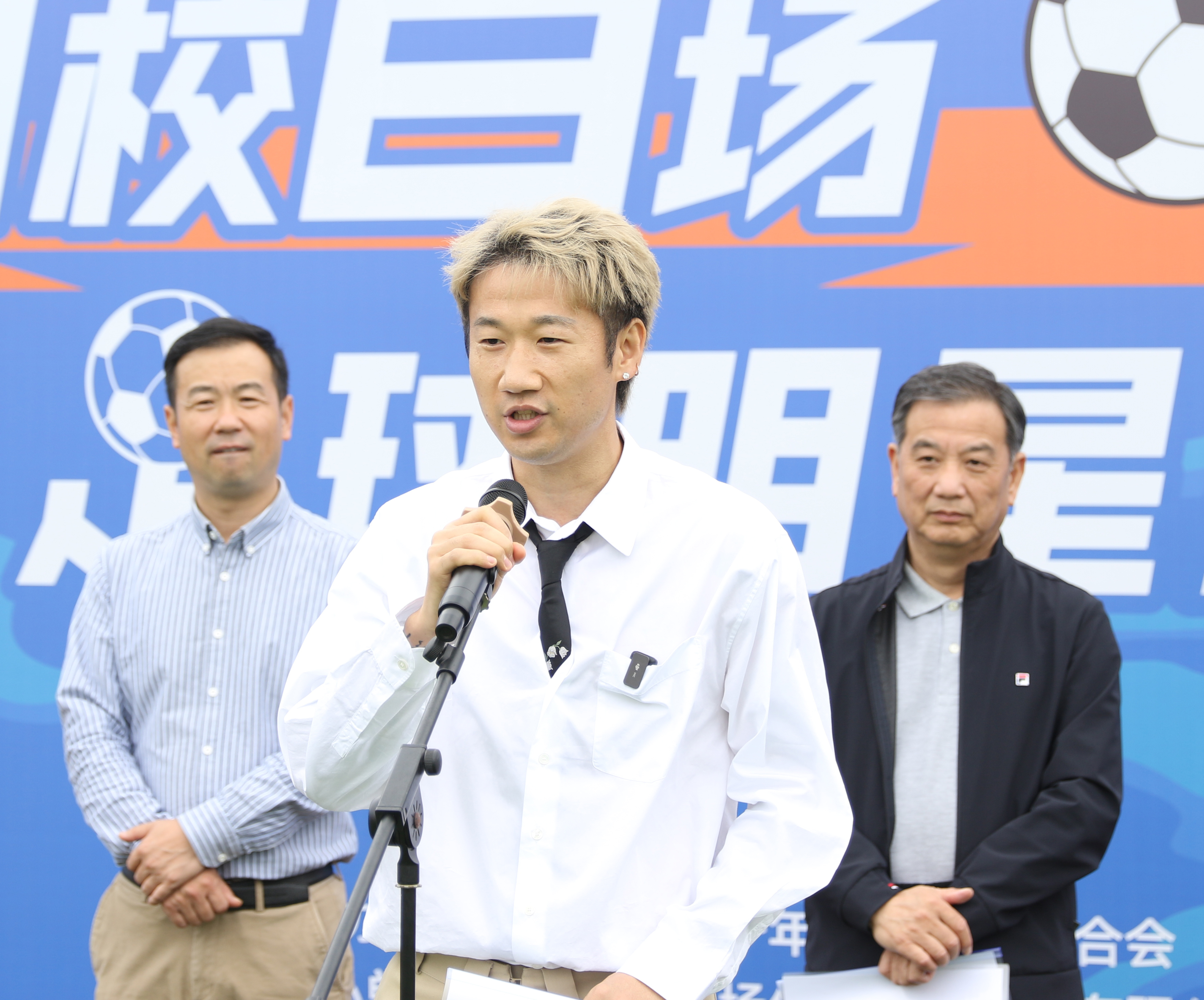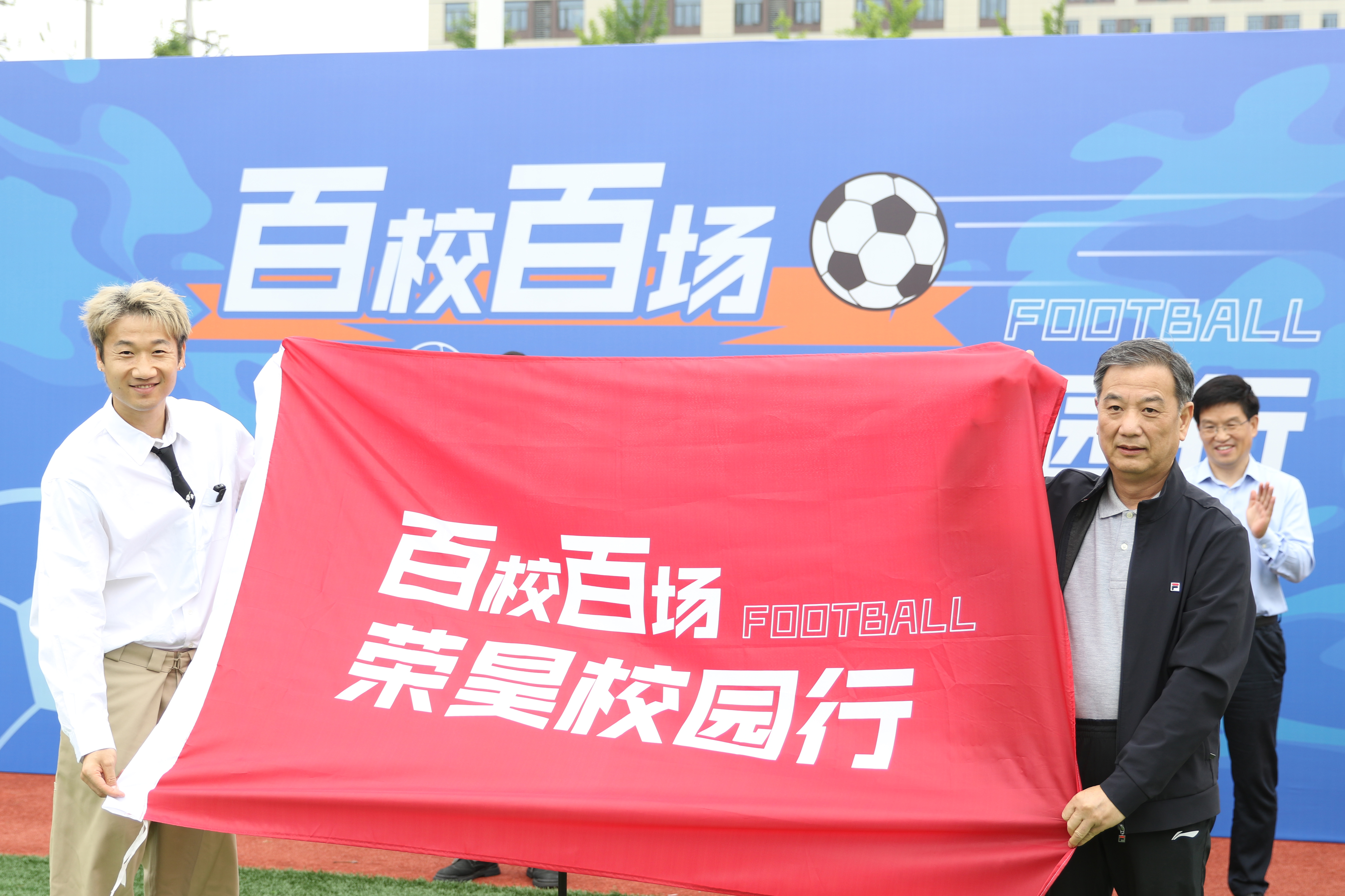 鲍学军向荣昊授旗,标志着“2024百校百场足球明星校园行”活动正式开启,这也是“百场”中的首场。