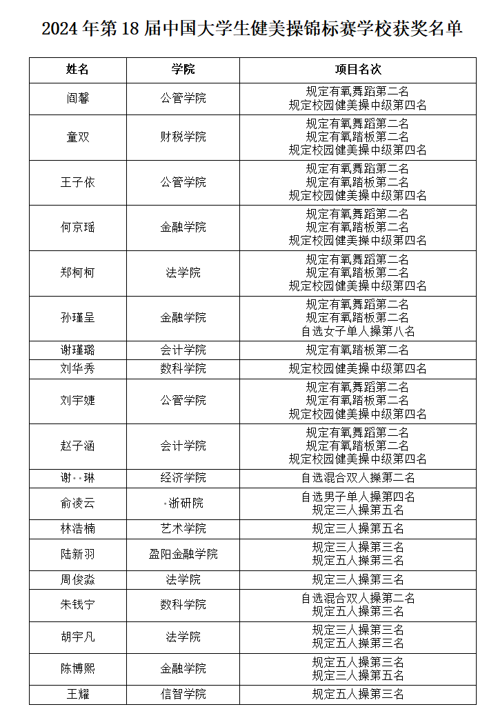 健美操队的运动健儿们奋力拼搏,获得甲组团体总分第一名,并获“体育道德风尚奖”荣誉称号。