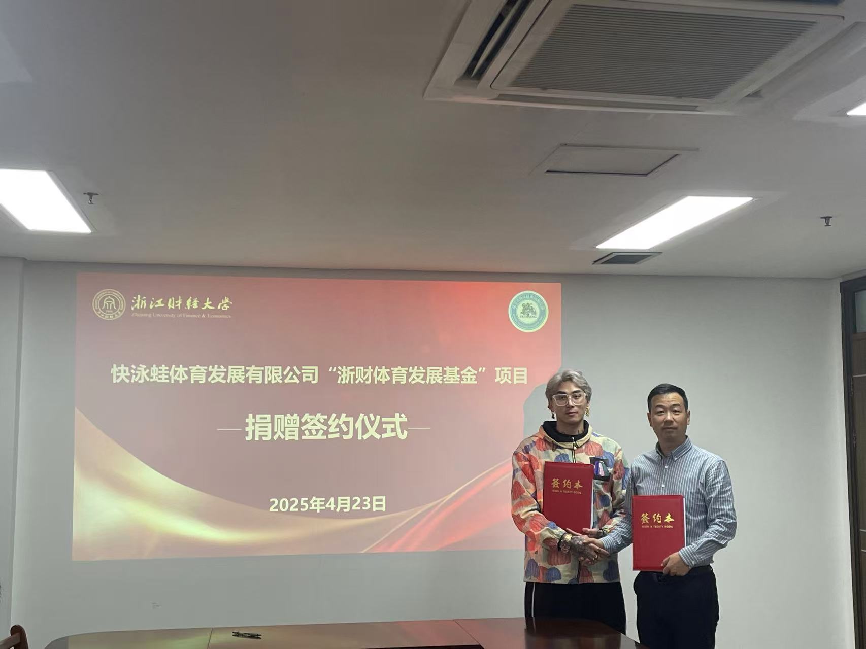 4月23日,瑞安市快泳蛙体育发展有限公司“浙财体育发展基金”捐赠签约仪式在西体育馆203会议室举行。成人在线