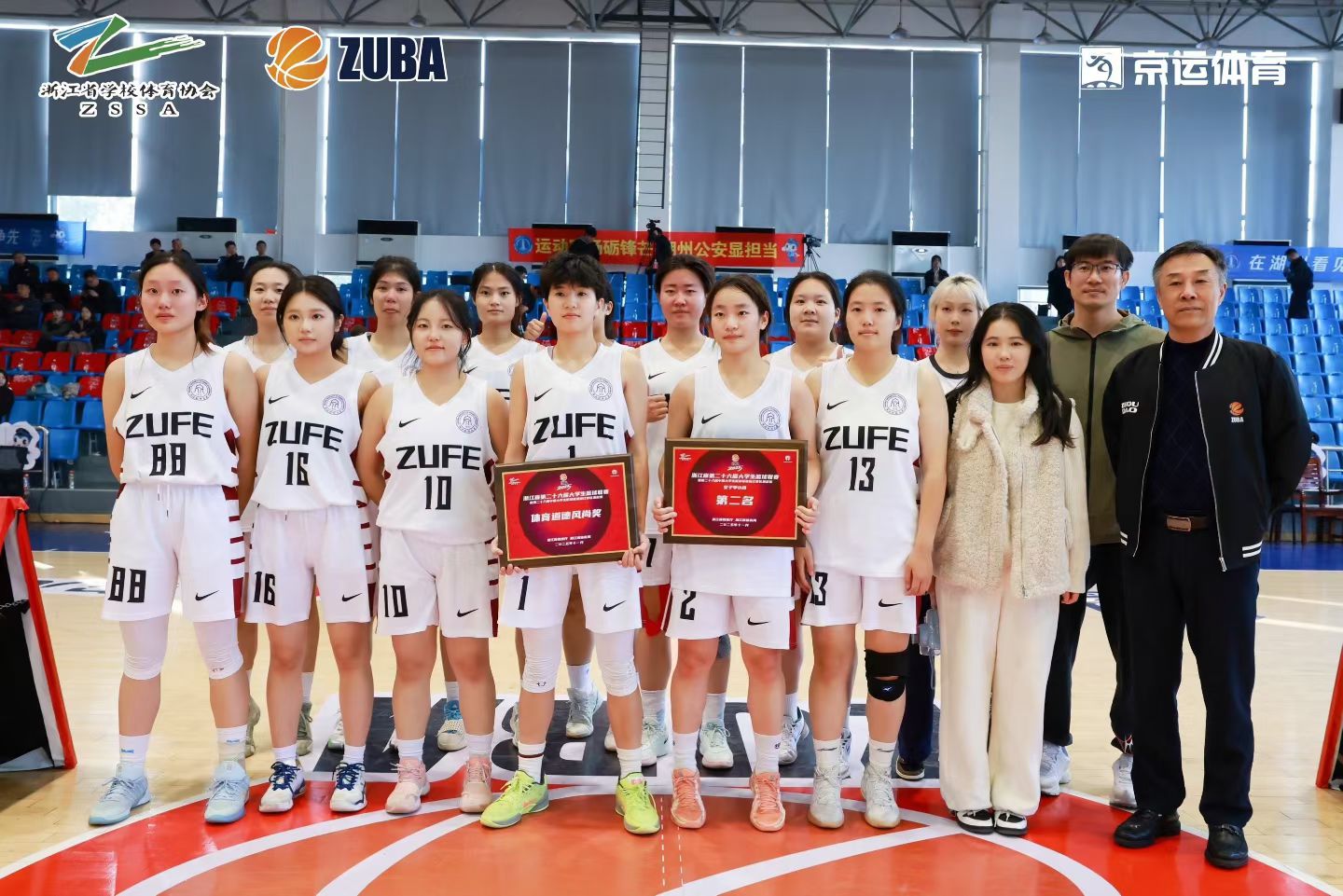 女篮队员们凭借顽强的拼搏精神和默契的团队配合,不畏强手、敢打敢拼,最终荣获亚军,并获得本次比赛的“道德风尚奖”,徐枝燕、张欣怡获得“优秀运动员”称号。