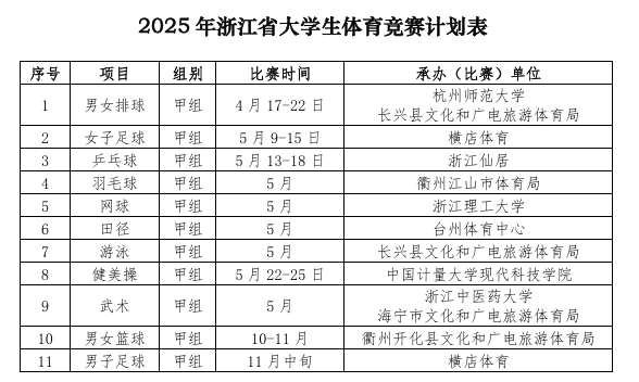 2025年浙江省大学生体育竞赛计划表