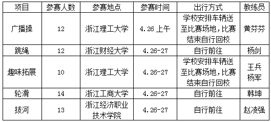 共参加轮滑、拔河、跳绳、趣味拓展、第九套广播体操五个项目,共有61名运动员,领队3人,教练员6人。
