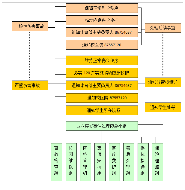 体育工作分管校领导、学生处等。事发后,由学生所在院系负责在2小时内将情况书面(或电子稿)报学院学生处、学院办公室。