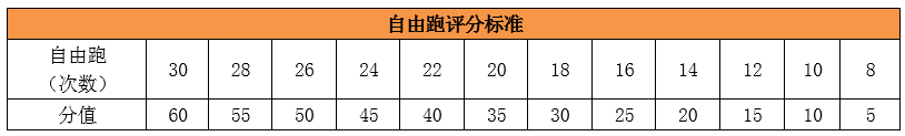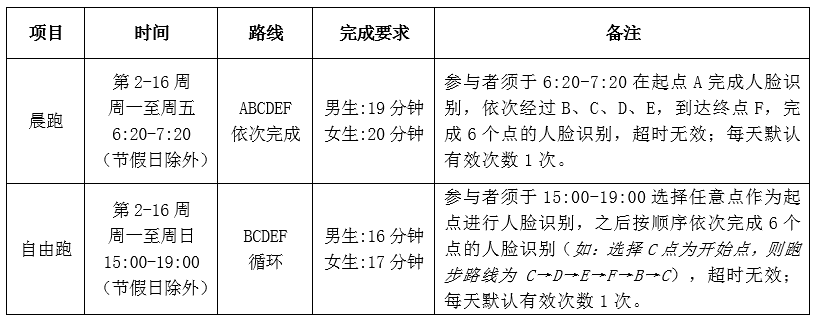 课余体育锻炼(100分)=晨跑(40分)+自由跑(60分),晨跑12次(40分)为必选内容(必须完成晨跑12次,否则课余体育锻炼0分),自由跑30次(60分)为自选内容,评分标准参照下表: