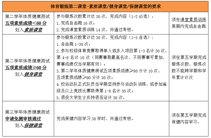 第二学年体质健康测试五项素质成绩<60分划入素质课堂,五项素质成绩≥60分划入健身课堂,第三学年体质健康申请免测审核通过划入保健课堂,须按要求参与锻炼,具体要求参照下表,另教务系统的体育锻炼成绩还未更新,将于第三周更新,请于第三周之后核实成绩!