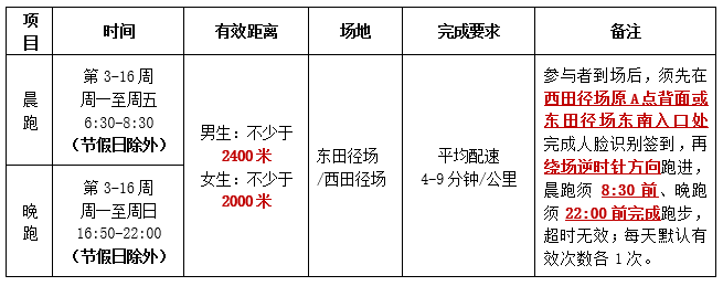 1.为保障运动安全,参与者须在东田径场/西田径场跑道内完成(根据便捷性以及场地的人流情况自行选择,建议晚跑下课高峰时段尽量前往东田径场),严禁逆向行进,在锻炼过程中避免翻看手机,不得戴口罩跑步,速度上根据身体和运动能力情况注意循序渐进,注重准备活动和放松练习,避免恶劣天气进行锻炼。