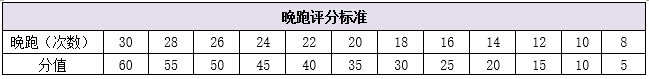 课余体育锻炼(100分)=晨跑(40分)+晚跑(60分),晨跑10次(40分)为必选内容(必须完成晨跑10次,否则课余体育锻炼0分),晚跑30次(60分)为自选内容,评分标准参照下表: