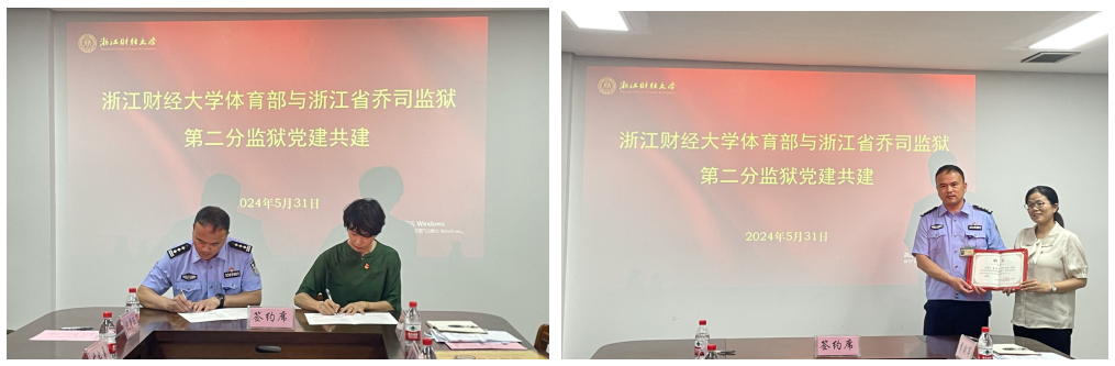 随后,成人在线 党总支、教工第一支部分别与浙江省乔司监狱第二分监狱党总支、三监区党支部签订了党建共建协议;成人在线 党总支聘请浙江省乔司监狱第二分监狱三监区党支部书记苗忠勇同志为校外党课教师。