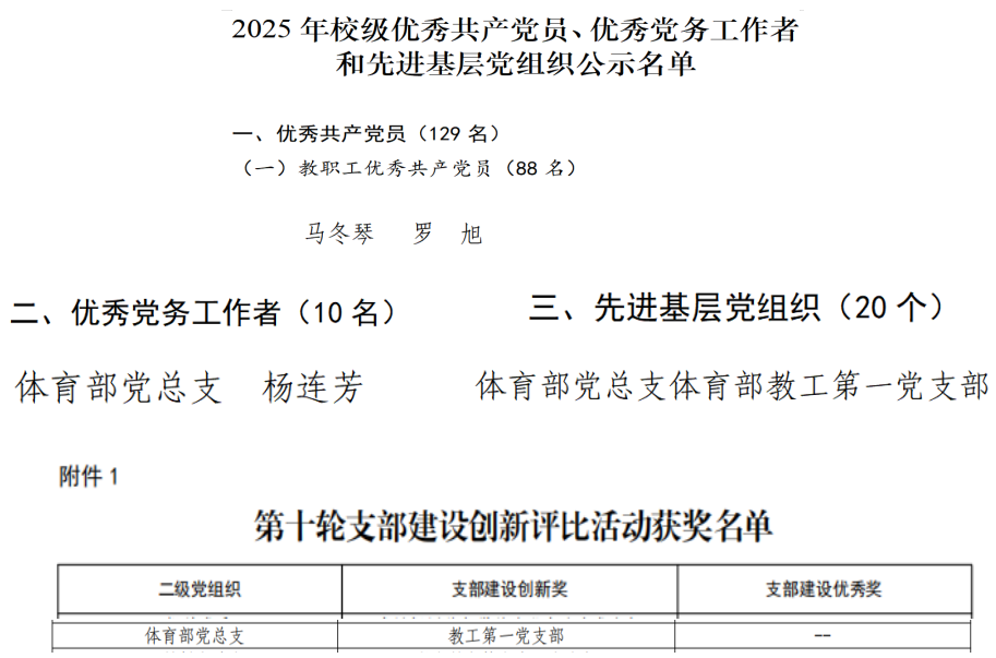 成人在线 公布了《2025年优秀共产党员、优秀党务工作者和先进基层党组织拟推荐对象公示》和《关于公布第十轮支部建设创新评比结果和第五批“双带头人”教师党支部书记示范工作室名单的通知》,成人在线 教工第一党支部获成人在线 先进基层党组织和第十轮支部建设创新奖,杨连芳老师荣获优秀党务工作者,马冬琴和罗旭老师荣获校优秀共产党员。